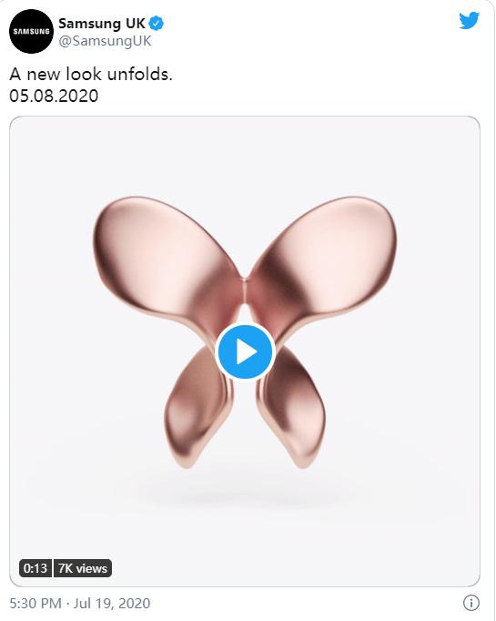昨天上午,三星英国官方在推特上发出了一张宣传图。这张图片乍看就是一只古铜色的蝴蝶,要知道 Galaxy Fold 系列的标志物正是蝴蝶,而古铜色则是本次 Galaxy Unpacked 发布会的主打配色,再配上 "A new look unfolds(新面貌得以展示)" 这句推文,似乎是在暗示三星 Galaxy Z Fold 2 即将在 8 月 5 日推出。