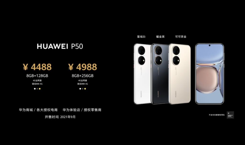 华为 P50 采用的是高通骁龙 888 4G 处理器,9 月份开卖,售价分别为: