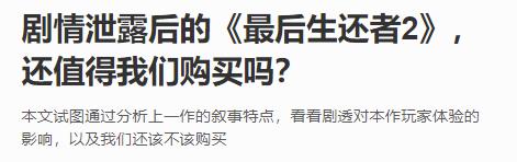 《 最后生还者 2 》这种单机大作也遭遇过内容泄露,连结局都被爆料了出来,这类游戏玩家很大一部分就是冲着剧情去的,结局一出来,这剧透的酸爽谁能顶得住啊?