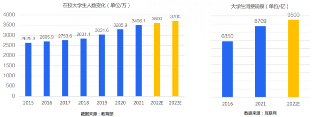 据教育部公开的数据,2021我国高等教育总规模达4430万人,到2022年经济规模将达到8709亿元,且有77%的大学生表示在学生时代消费或种草的品牌会在毕业后继续消费,学生将成为未来品牌营收的中坚力量。