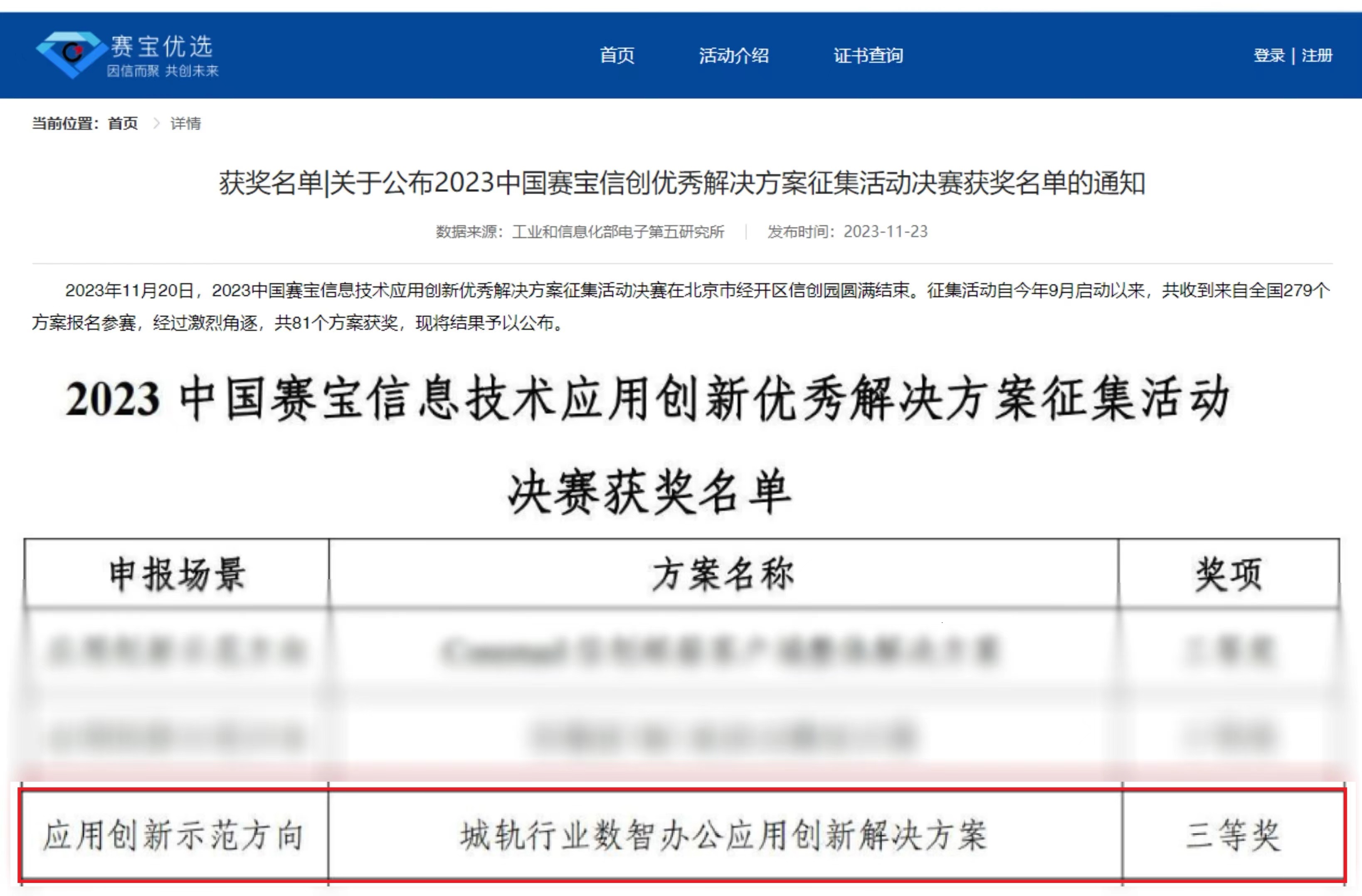 擎云科技《城轨行业数智办公应用创新解决方案》经历了活动报名、形式审查、初赛评审、决赛路演、结果公示等多个环节的层层考察,最终被评定为“应用创新示范三等奖”。