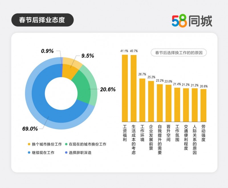 从2024年就业市场走势看,消费回暖的同时,就业压力仍存,令不少年轻人下决心“深耕”现在的岗位。报告显示,有69%的职场人在春节后将继续从事目前的工作,选择继续在当前城市工作主要出于人际关系的考虑,其次是就业岗位选择多。