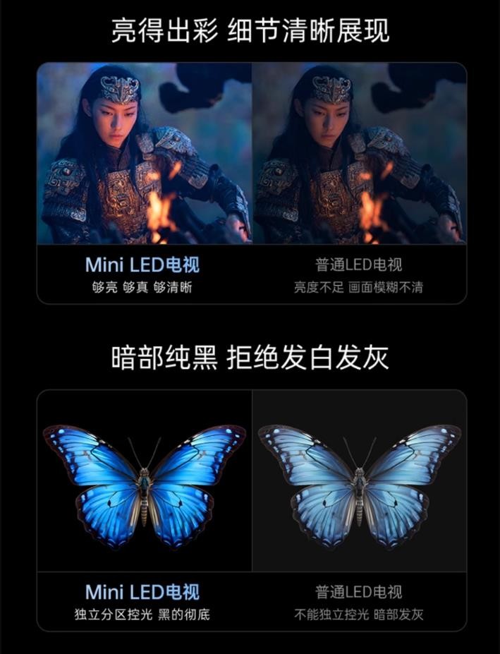 创维A4F的核心竞争力,源于其搭载的Mini LED背光技术。不同于传统LED电视仅有几十个背光分区,A4F通过上百个独立控光分区,实现了对画面亮暗的精准调控,配合支持HDR视频的技术方案,使得画面亮部区域耀眼而不失层次,暗部场景则深邃且细节清晰可见。以75英寸版本为例,当背光分区数只有几十时,对画质的提升效果几乎为0;当达到百级分区时,单分区尺寸为11.1cm×15.6cm,画面对比度提升至接近5倍,使亮部耀眼有层次、暗部深邃有细节。电影中的夜色、高速动作场景下的明暗切换,都能清晰呈现每一帧细节,真正让暗场细节不再丢失,亮场画面不泛白。