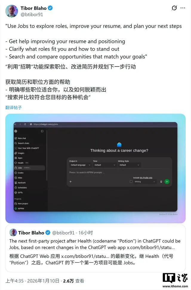 1 月 10 日消息,科技媒体 bleepingcomputer 昨日(1 月 9 日)发布博文,报道称 OpenAI 正为 ChatGPT 测试“工作”(Jobs)功能,定位 AI 职场规划助手,帮助用户优化简历、明确职业定位、筛选匹配职位及...