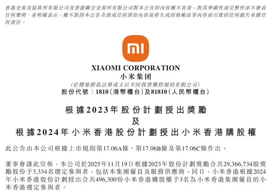 11 月 20 日消息,小米集团 11 月 19 日晚发布公告宣布,公司根据 2023 年股份计划奖励合共 29366734 奖励股份予 3334 名选定参与者,包括集团雇员及服务供应商。