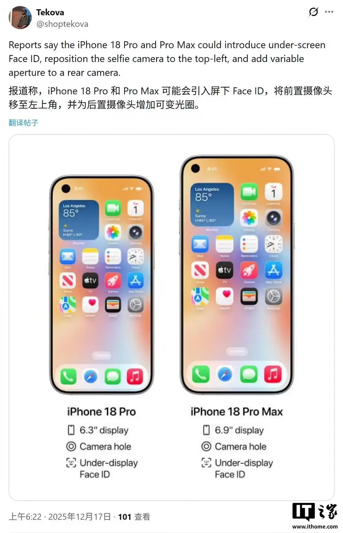消息称苹果iPhone 18 Pro/ Max摒弃药丸状挖孔 改用左上角单打孔+屏下Face ID