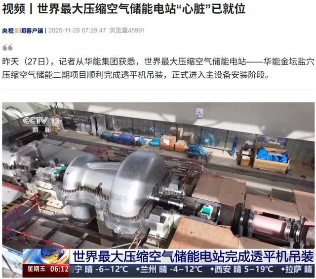 11 月 28 日消息,据央视新闻报道,昨天(27 日),记者从华能集团获悉,世界最大压缩空气储能电站 —— 华能金坛盐穴压缩空气储能二期项目顺利完成透平机吊装,正式进入主设备安装阶段。