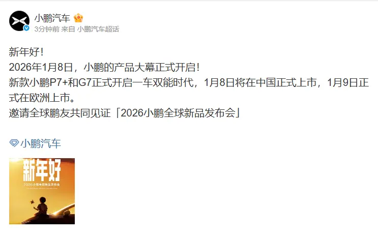 2026小鹏新款P7+、G7定档:1月8日中国上市,1月9日欧洲上市
