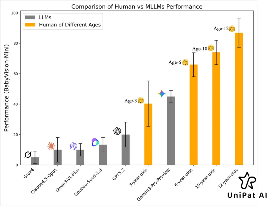1月12日,近日,红杉中国旗下评测体系xbench与UniPat AI团队联合发布全新多模态理解评测集BabyVision,旨在系统评估大模型在不依赖语言提示下的纯视觉基础能力。