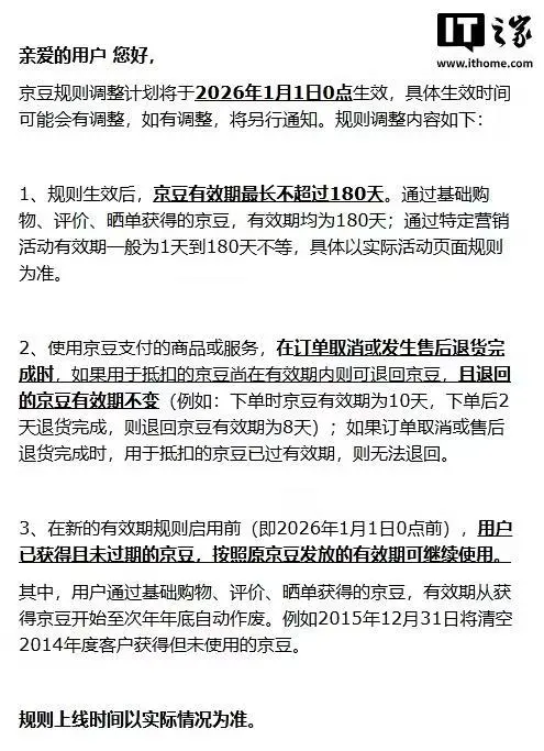 11 月 28 日消息,京东今日发布公告,宣布京豆规则调整计划将于 2026 年 1 月 1 日 0 生效。