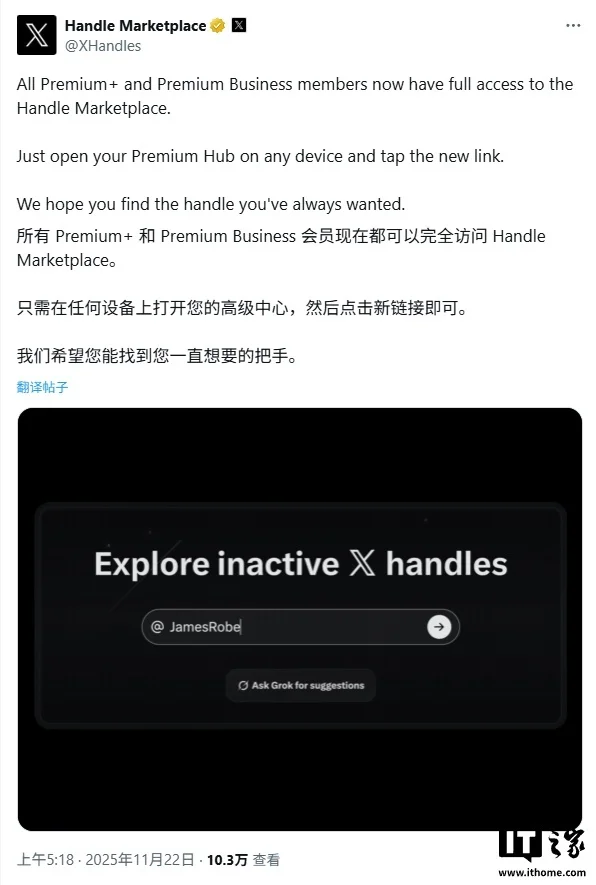 11 月 24 日消息,科技媒体 TechSpot 昨日(11 月 23 日)发布博文,报道称埃隆・马斯克(Elon Musk)旗下的 X 平台正式上线会员“靓号”服务,推出用户名交易市场(Handle Marketplace),允许用户购买并...