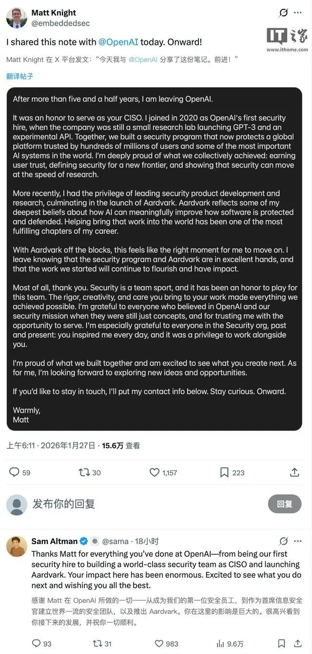 1 月 28 日消息,北京时间 1 月 27 日,OpenAI 副总裁兼首席信息安全官(CISO)马特 · 奈特(Matt Knight)宣布将辞职,他在公司已任职超过 5 年。