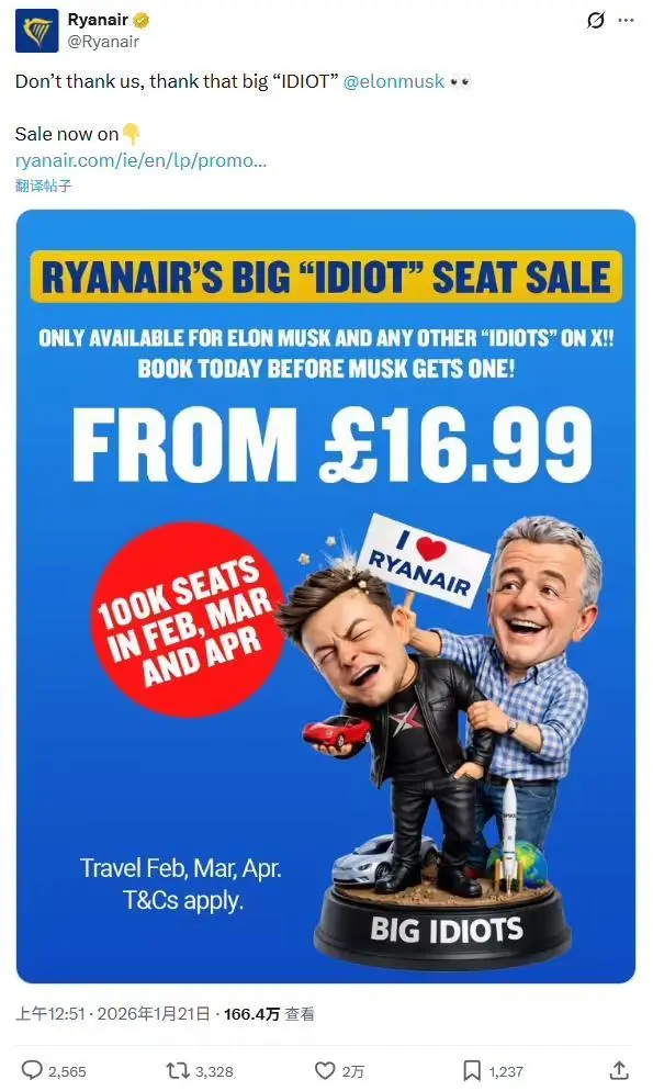 瑞安航空宣布推出“大傻瓜”特价机票,称专为马斯克和X上的傻瓜准备