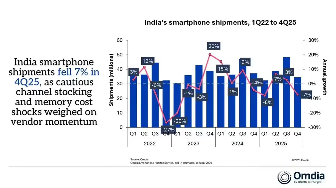 1 月 21 日消息,市场调查机构 Omdia 昨日(1 月 20 日)发布博文,报告称受存储芯片成本上涨、卢比贬值及需求疲软影响,2025 年第 4 季度印度智能手机出货量为 3450 万台,同比下降 7%;2025 全年出货量...