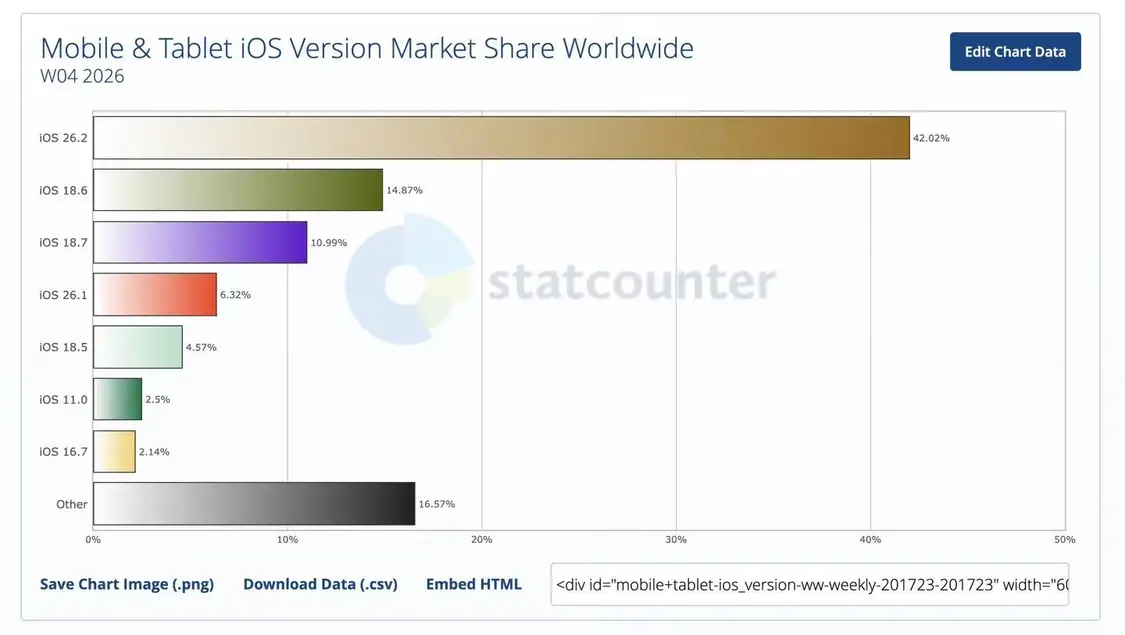 1 月 28 日消息,当地时间 1 月 27 日,据外媒 MacRumors 报道,StatCounter 最新数据显示,iOS 26 的普及率目前约在 50% 左右,仍有不少用户对升级保持谨慎态度。