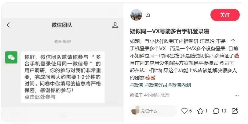 11 月 7 日消息,本周有部分微信用户反馈称收到了微信团队发来的邀请,主题是关于“多台手机登录使用同一微信号”的用户调研。