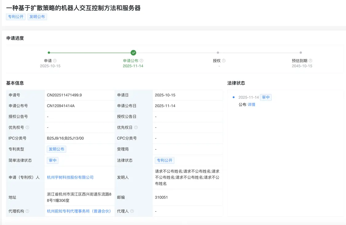 11月14日,天眼查示,宇树科技股份有限公司申请的“一种基于扩散策略的机器人交互控制方法和服务器”专利公布。