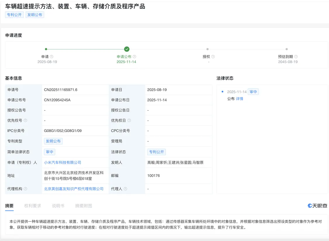 11月14日,天眼查显示,近日,小米汽车科技有限公司申请的“车辆超速提示方法、装置、车辆、存储介质及程序产品”专利公布。