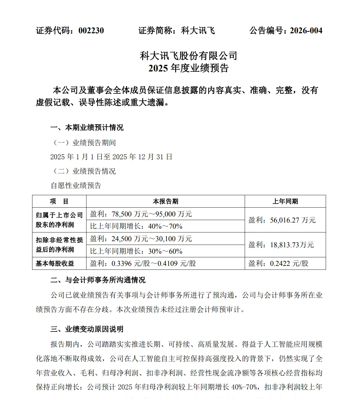 科大讯飞:2025年净利同比预增40%-70% 人工智能应用规模化落地取得成效