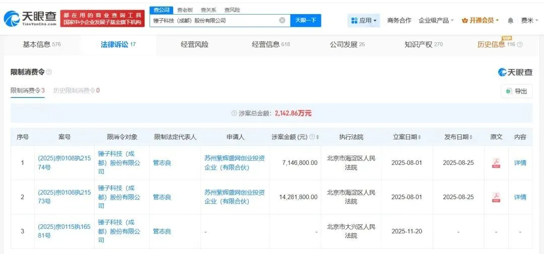 1月28日,天眼查天眼风险信息显示,近日,锤子科技(成都)股份有限公司及其法定代表人管志良新增一则限制消费令,执行法院为北京市大兴区人民法院。