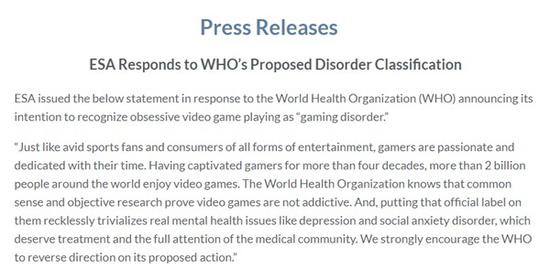其中ESA的成员包含卡普空、EA、任天堂、索尼互动娱乐、史克威尔艾尼克斯、Take-Two、育碧等国际一线大厂。联合声明表示,全球已超过20亿人正安全且明显地享受着游戏,游戏产品在教育、治疗、和娱乐等领域的价值已得到广泛证明,协会对WHO将‘游戏成瘾’列入ICO-11表示担忧,希望WHO对所持证据有更加全面的考虑。