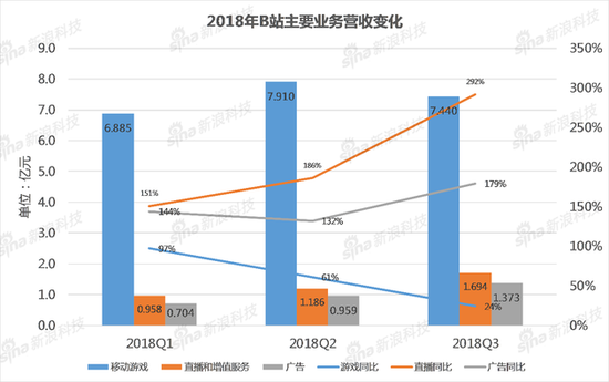 不过,B站的其他业务正快速扩张。第三季度,B站来自于直播和增值服务的营收增长至1.694亿元,同比增幅为292%。来自于广告的营收为人民币1.373亿元,同比增幅为179%。就整体营收而言,直播和广告正成为拉动B站成长的新引擎。