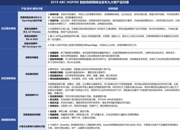 据悉,百度智能云发布的9大新产品分别是:边云融合领域的智能边缘BIE2.0,以及3款物联网智能边缘硬件;时空洞察领域的地图空间服务、货运路径规划,和智能调度ROS;在数据智能领域的时序洞察和小度企业音箱行业解决方案。