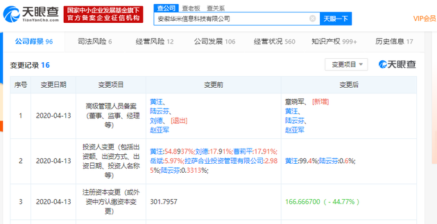 除了上述股东发生调整外,华米科技注册资本由约301.8万元减少至约166.7万元,减少的注册资本数额超过135万元,降幅比例近45%。