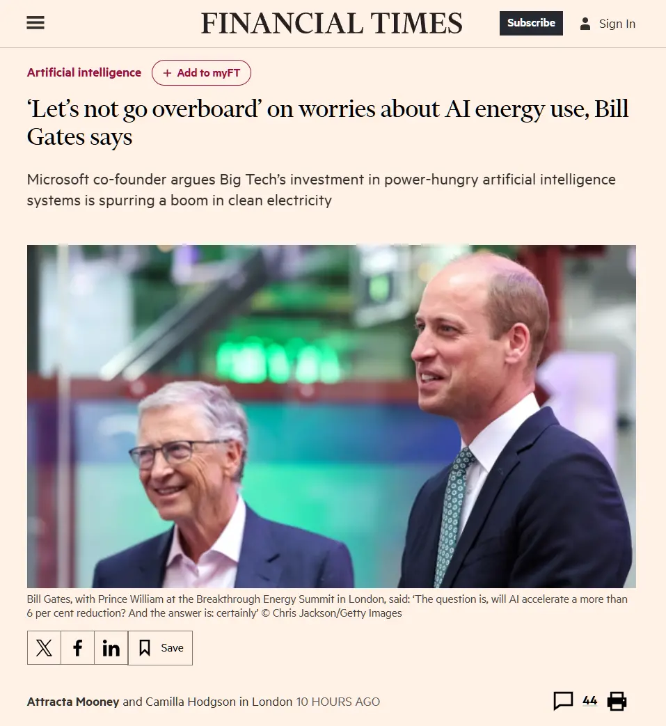 6 月 28 日消息,据《金融时报》北京时间今日报道,针对当前 AI 系统导致能源消耗加快的问题,比尔・盖茨发起了“辩护”,他认为 AI 技术最终将会“抵消”其耗电量。