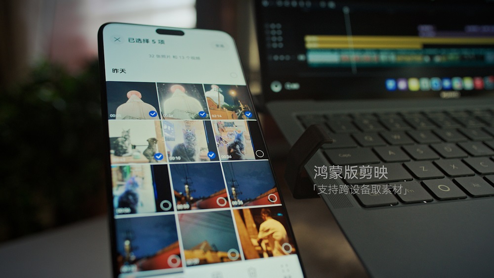剪辑赶工时,于昌禾也不需要手忙脚乱。通过鸿蒙版剪映的素材跨端拖拽功能,他只需要拿着一只鼠标就能在电脑和手机前自由拖拽素材,灵活剪辑,让灵感不为琐事卡壳。