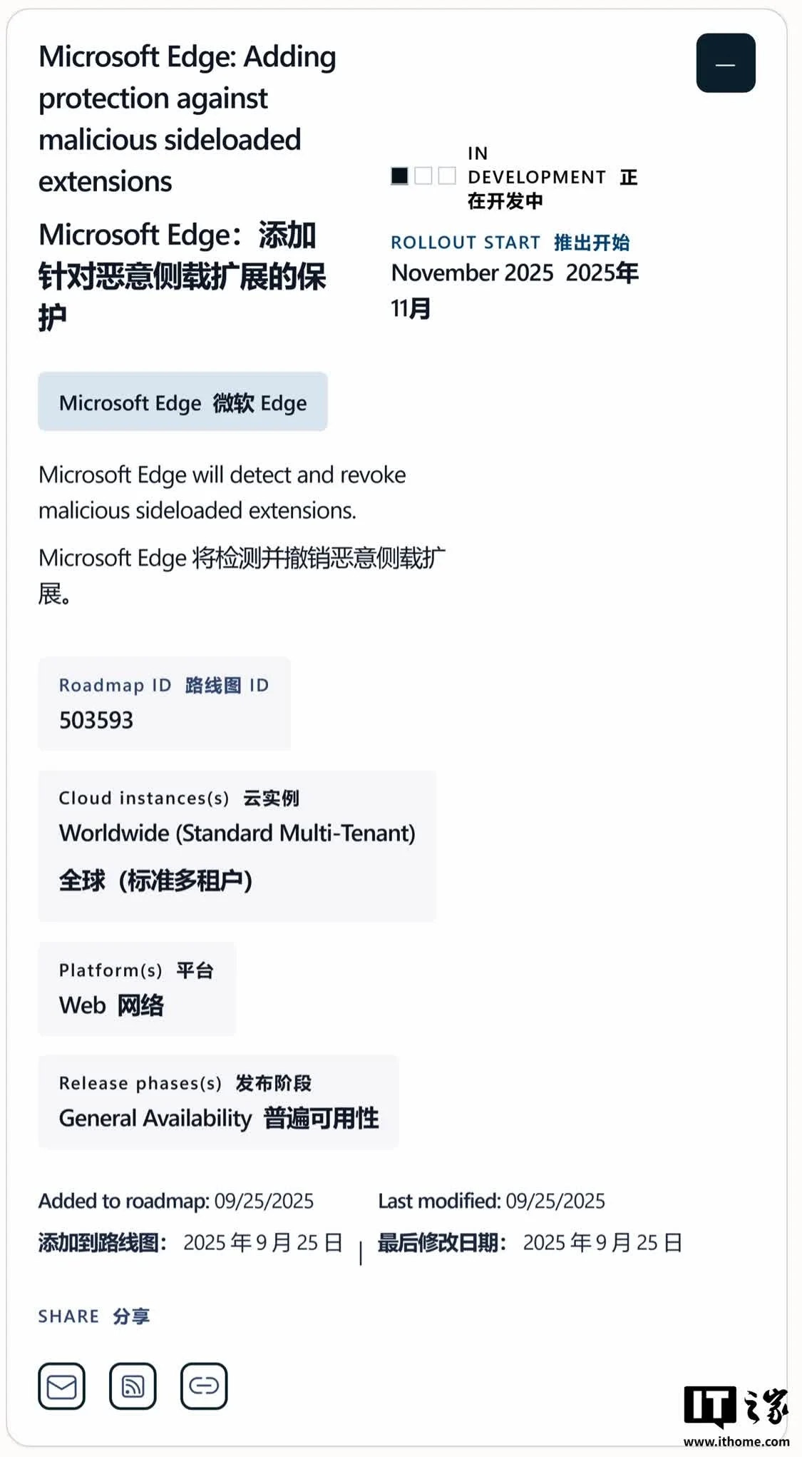 根据微软官方发布的 Microsoft 365 路线图,这项针对恶意侧载扩展的防护功能目前被标记为“正在开发中”,预计将在 2025 年 11 月正式向所有用户推送。