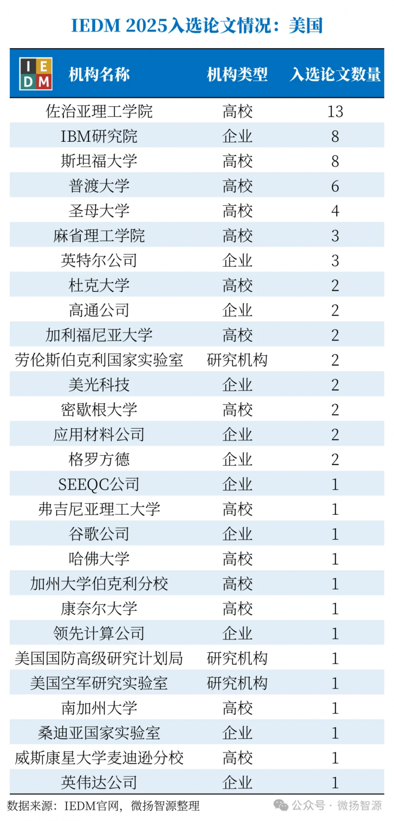IEDM 2025美国入选论文共74篇,按照第一作者所在机构统计,74篇论文来自28个机构。排在前5的分别是佐治亚理工学院(13篇)、IBM研究院(8篇)、斯坦福大学(8篇)、普渡大学(6篇)、圣母大学(4篇)。