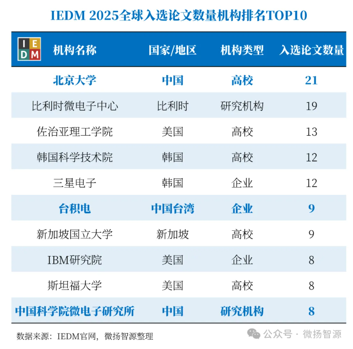 全球顶尖机构的入选论文数量排名竞争异常激烈。按照第一作者所在机构统计,北京大学入选21篇,以绝对优势继续蝉联全球第一,彰显其在国际领域的顶尖地位。随后依次为比利时微电子中心(19篇)、佐治亚理工学院(13篇)、韩国科学技术院(12篇)、三星电子(12篇)、台积电(9篇)、新加坡国立大学(9篇)、IBM研究院(8篇)、斯坦福大学(8篇)、中国科学院微电子研究所(8篇)。
