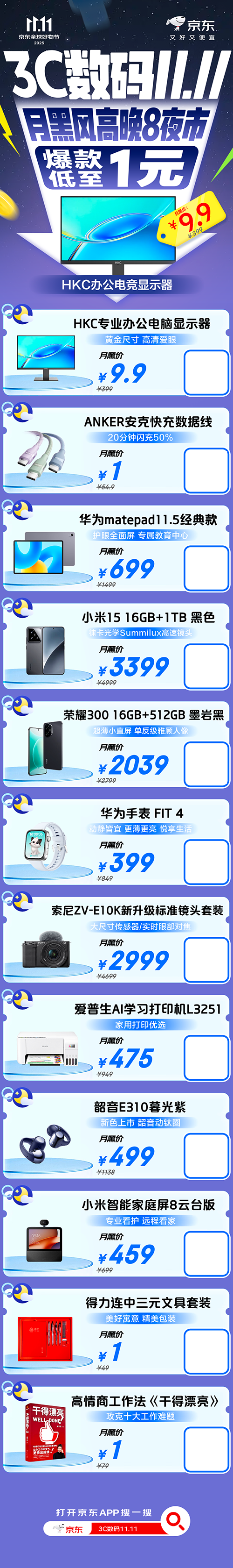 今年京东11.11重磅推出「月黑风高晚8夜市」专属频道,每晚都有不同主题,覆盖潮流好物、生活必需等全品类商品,大牌低至1折限时抢。邀请好友助力,更有机会获得“买1得1111”现货膨胀福利。首场主题夜市将于10月9日晚8点热闹“开张”,众多好物等你来选:HKC专业办公电脑显示器月黑价9.9元;ANKER安克快充数据线月黑价1元;华为matepad11.5经典款月黑价699元;小米15 16GB+1TB 黑色月黑价3399元;荣耀300 16GB+512GB 墨岩黑月黑价2039元;华为手表 FIT 4月黑价399元;索尼ZV-E10K新升级标准镜头套装月黑价2999元;爱普生AI学习打印机L3251月黑价475元;韶音E310暮光紫月黑价499元;小米智能家庭屏8云台版月黑价459元;得力连中三元文具套装月黑价1元;高情商工作法《干得漂亮》月黑价1元。