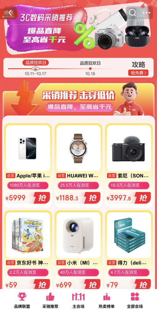 如果想更快一步锁定好物,京东11.11的“尖货抢先购”不容错过,爆款直降、福利加码,提前带来京东11.11的高潮:Mate 70 Pro 12+512曜石黑限时直降,支持12期免息,预估到手价5999元;iPhone 16 Pro预估到手价5999元;索尼微单相机 ZV-E10K,赠索尼xFGO联名腕带,预估到手价3998元;华为MatePad爆款直降,买赠教育课程,预估到手价1105元;华硕显示器 XG27AQDMGR京东独家包销,爆款直降,预估到手价2999元;得力M2000W 激光打印机,爆款直降,晒单赠50元E卡,预估到手价719元;元萝卜 AI下棋机器人限量5台5折促销,预估到手价2999元;哈曼卡顿琉璃4黑金预估到手价1899元;倍思极客充145W/2万毫安限时直降,预估到手价259元;大疆OP3全能套装限时直降900元,到手仅需3599元;罗技无线人体工学键鼠套装预估到手659元;《如果历史是一群喵》1-15全套单品4折到手359.99元;网易云黑胶vip年卡到手68元;得力72色丙烯马克笔99元。