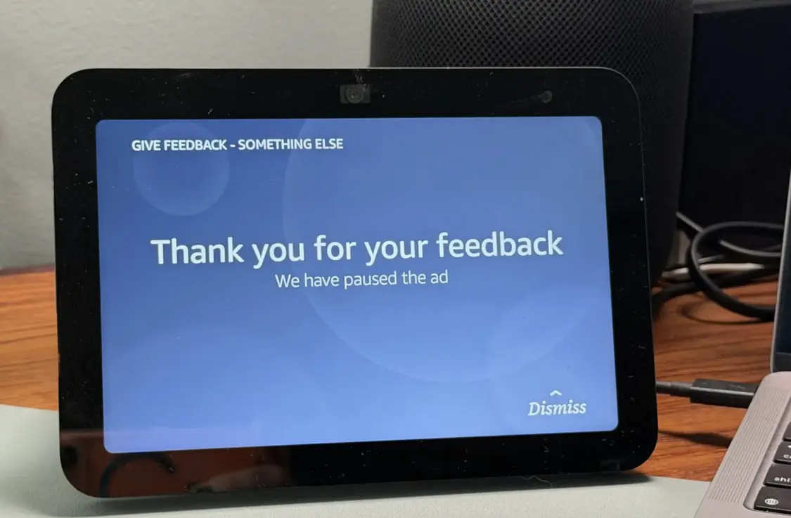 对此,亚马逊发言人 Lauren Raemhild 回应 The Verge 称:“广告只是体验的一小部分,帮助用户发现可能感兴趣的新内容和产品。如果用户不喜欢某条建议,可以滑动跳到下一屏,或通过信息图标直接提供反馈”。但外媒选择“反馈”成功关掉屏幕上的一条广告后,很快又出现了新的其他广告。