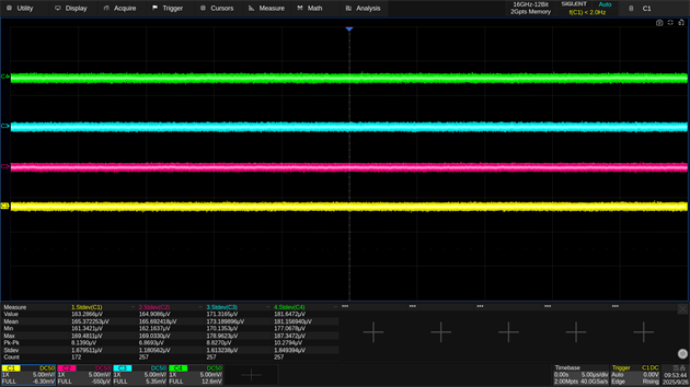 SDS8000A系列采用高性能硬件架构,四通道均可实现176 μVrms(typ.)的超低本底噪声,该噪声指标与12-bit高分辨率完美匹配,有效降低仪器自身对被测信号的干扰,即便在高带宽与高速采样条件下,仍能保持信号的纯净度与真实性,为工程师在精密测量及前沿科研应用中提供更可靠的波形保真度。