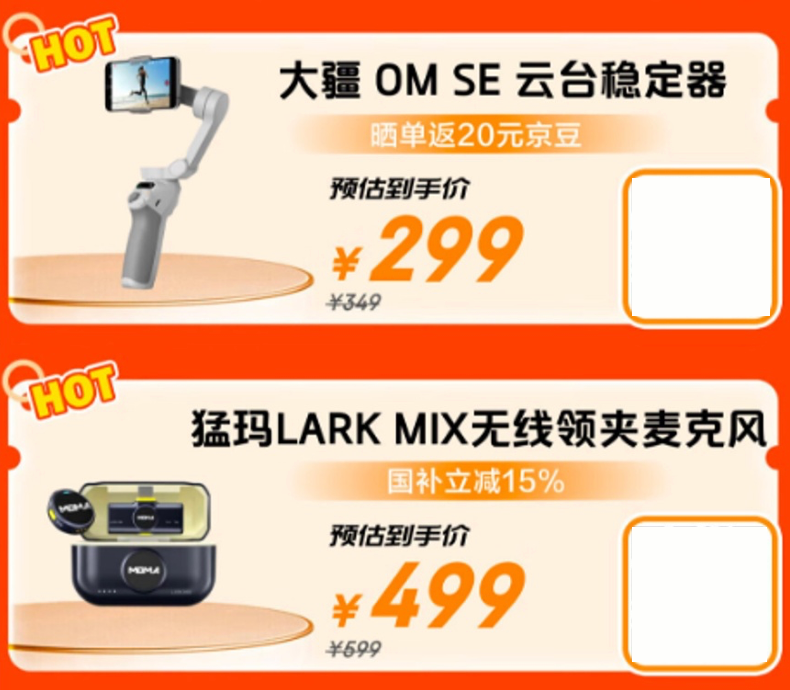 对于热爱创作的消费者来说,一款趁手的设备能够让我们的创作过程更加顺畅,记录生活中的美好瞬间也变得更加得心应手。大疆OSMO MOBILE SE云台稳定器,搭载新一代控制算法,可根据云台姿态实时补偿,有效消除画面抖动,还具备智能跟随6.0功能,精准追踪拍摄目标。机身可折叠,便于收纳携带,京东11.11预估到手价299元,晒单还可返京豆。猛玛LARK MIX无线领夹麦克风,采用纽扣设计,仅重9克,支持双重降噪与精准收音,续航长达40小时,传输距离达300米,让创作更加从容,预估到手价499元。