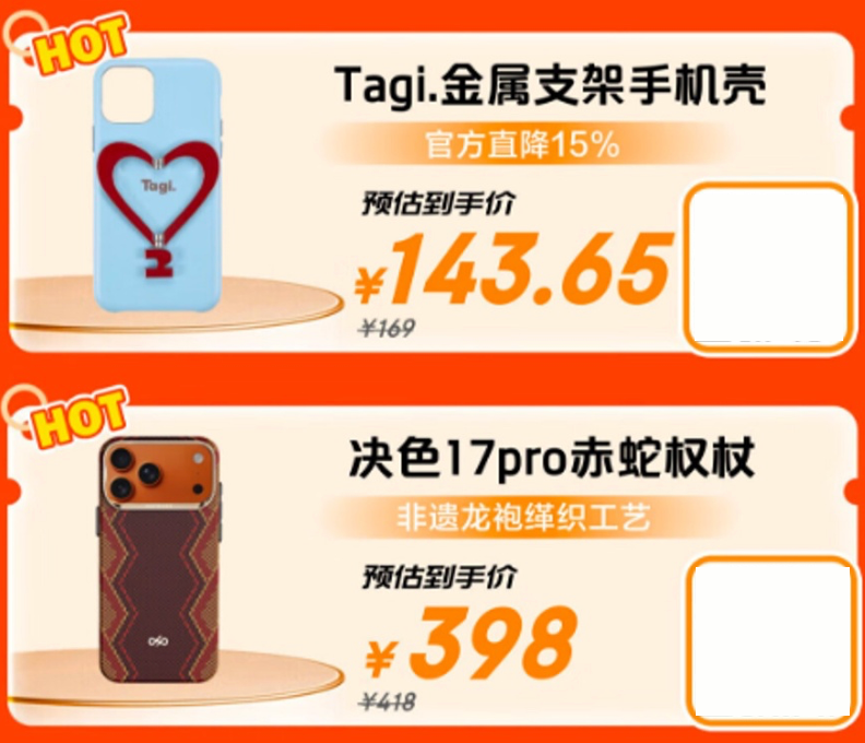 手机壳作为我们日常必备的配件,不仅能够保护手机,还能为我们的手机增添一份独特的时尚感。Tagi让人开心金属支架手机壳色彩明快,搭配可自由切换的金属爱心支架,既可手持又能支撑,中间爱心部分还能当作镜子使用,兼具美观与实用,预估到手价143.65元。决色iPhone 17 Pro Max赤蛇权杖手机壳融入非遗龙袍缂织工艺,图案栩栩如生,结合芳纶纤维与金属材质,带来独特视觉与手感,预估到手价398元。