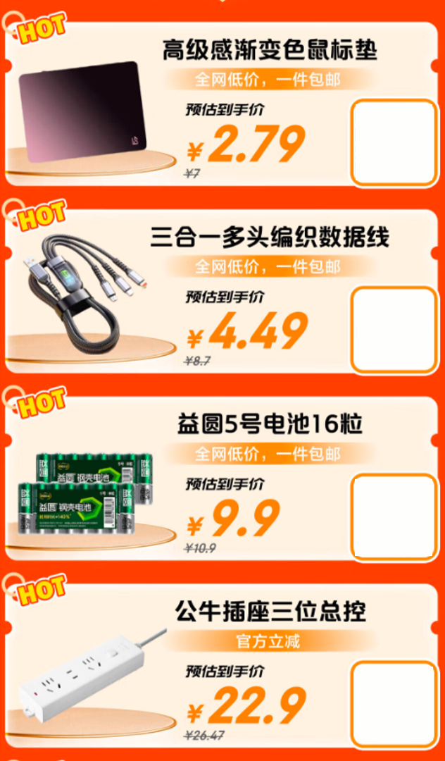 除了以上这些高品质的配件,京东11.11还准备了多款高性价比的实用配件。京喜自营灵蛇专业电竞鼠标垫,预估到手价仅需2.79元;三合一多头编织数据线,支持多种设备,预估到手价4.49元,以上单品一件即包邮,现货速发无需等待。益圆5号电池16粒装,到手价低至9.9元,同样一件包邮;公牛三位总控插座,预估到手价22.9元。各类配件覆盖日常所需,价格亲民,满足办公、居家、出行等多种场景的使用需求。