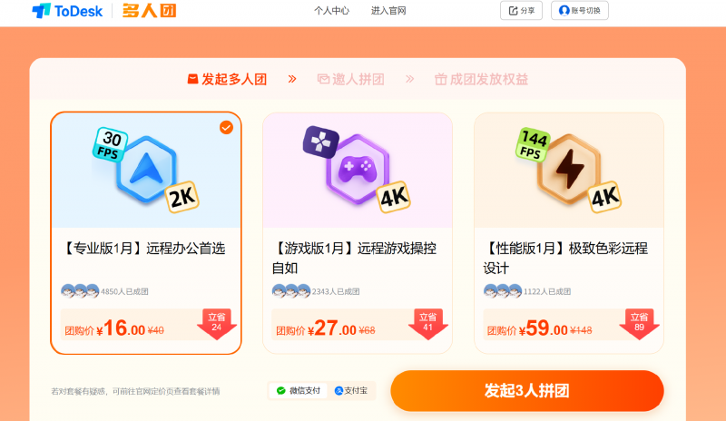 ToDesk远程控制服务推出重磅拼团活动,让高效远程连接变得更加触手可及。新人两人即可成团,非新人也仅需三人组团,即可享受专业版、游戏版、性能版三大版本的四折超值优惠!
