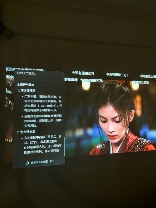 为了提升用户在卧室场景中的使用体验,大眼橙C3D投影仪首度接入“腾讯混元大模型”,对AI语音助手进行了全面升级,为用户打造了专属的卧室AI搭子,只需一句话,AI语音助手就能快速理解并作出响应,例如 “找最近火的甜宠剧”、“帮我复盘上集剧情”、“扫毒风暴里周少雄杀云安娜的原因”、“帮我制定个北京三日游攻略” 等等。通过AI语音助手不仅能够实现对投影仪的全方位控制,如调节亮度、切换剧集、调整音量等,还能提供丰富的生活陪伴服务,极大地提升了用户在卧室场景中的娱乐体验和生活便利性。