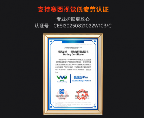 考虑到用户在卧室中通常会长时间近距离观影,大眼橙C3D投影仪特别注重护眼功能的打造,通过了国家权威机构“赛西实验室”的视觉低疲劳认证,从光源和色域调校两方面入手,有效降低有害蓝光,减少了对眼睛的伤害。此外,大眼橙C3D还特别打造了“卧室模式”,在该模式下,投影仪的亮度更加适宜,画面光线进一步柔和,风噪声也更小,为用户提供了更加舒适、健康的观影环境。