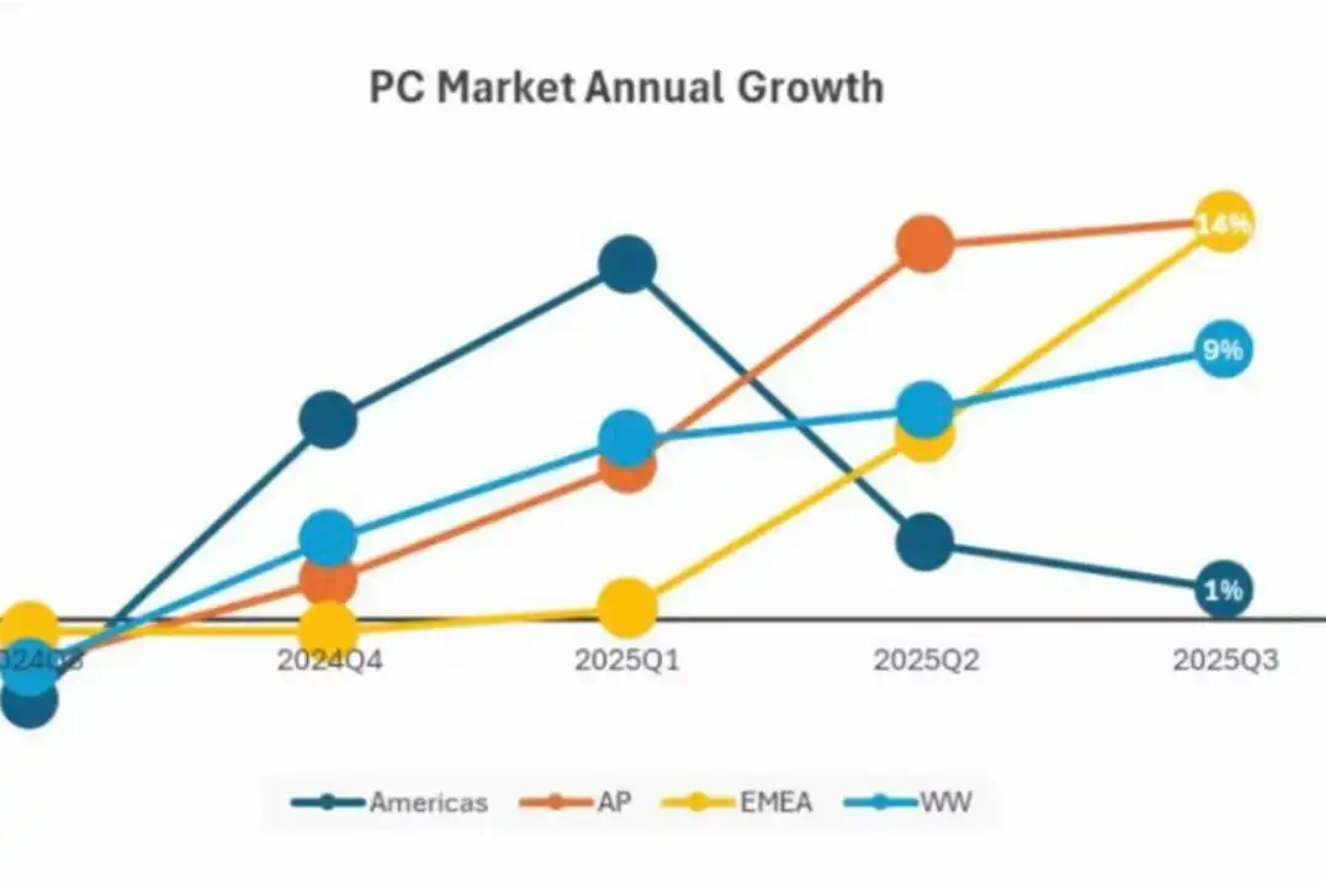 其中,亚太地区(含日本与中国)和欧洲、中东和非洲地区(EMEA)实现了两位数的增长,增速均达14%。IDC表示,在亚太地区,日本推进的“GIGA 教育项目”(教育数字化基础设施建设项目)带动PC增长,AI和国补带动中国PC市场的销量增长。