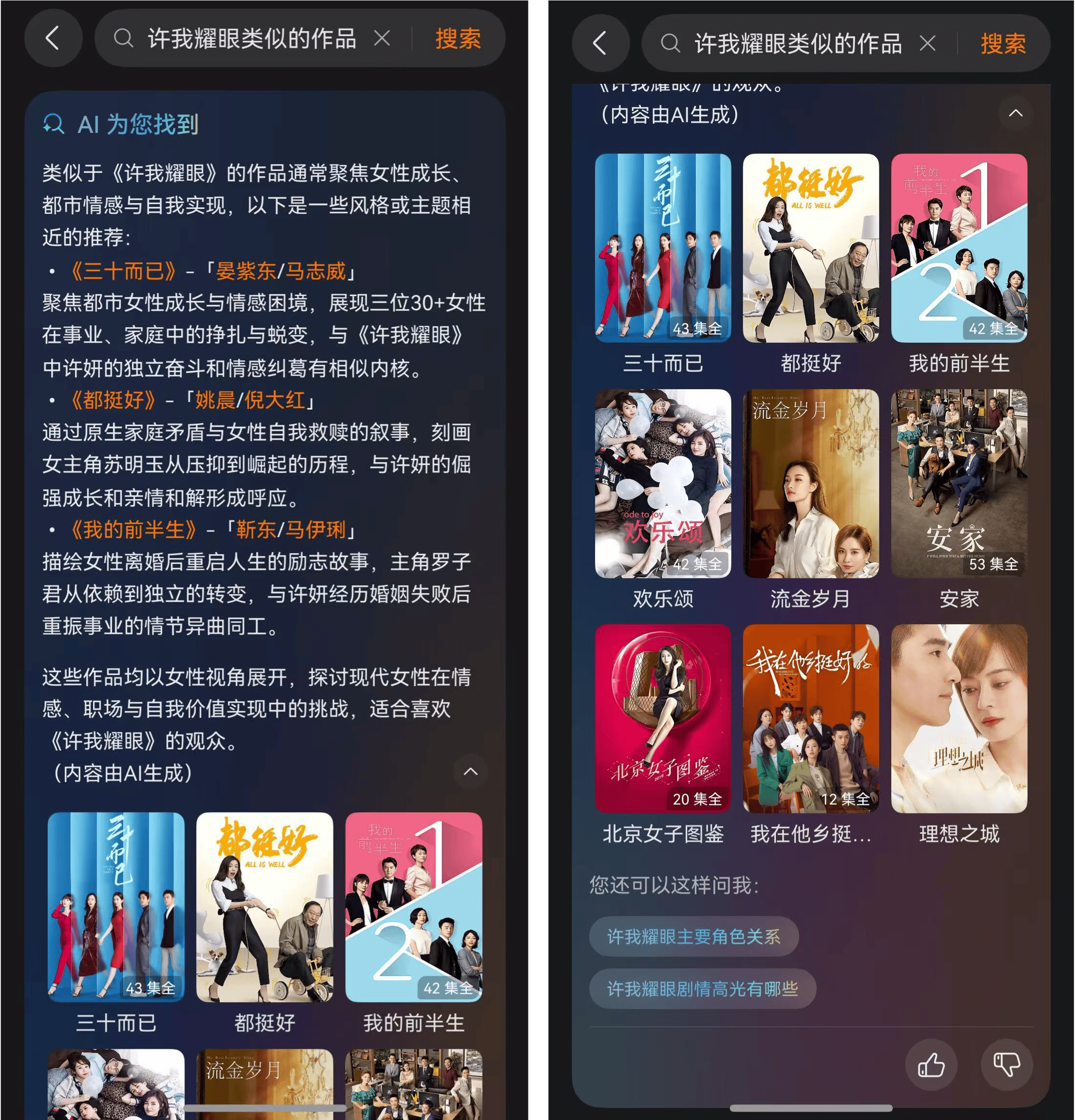 国庆长假我很快追平了《许我耀眼》的全部更新,因为一直在旅途中也没有多的精力去精挑细选,我发现了华为视频的另一个宝藏功能——华为视频的“AI搜”,能帮我找到更多好内容。比如我,刷完许妍这种人间清醒、事业爱情两手抓的大女主,就特别想找点同类型的爽剧接着看。我只需要在搜索框输入:“《许我耀眼》类似的作品。”华为视频就会精准推荐《三十而已》《都挺好》《我的前半生》等作品。这个功能对于我们这种追完一部好剧就容易陷入“剧荒”的人来说,真的太友好了,就像一个很懂你的选片小助手。