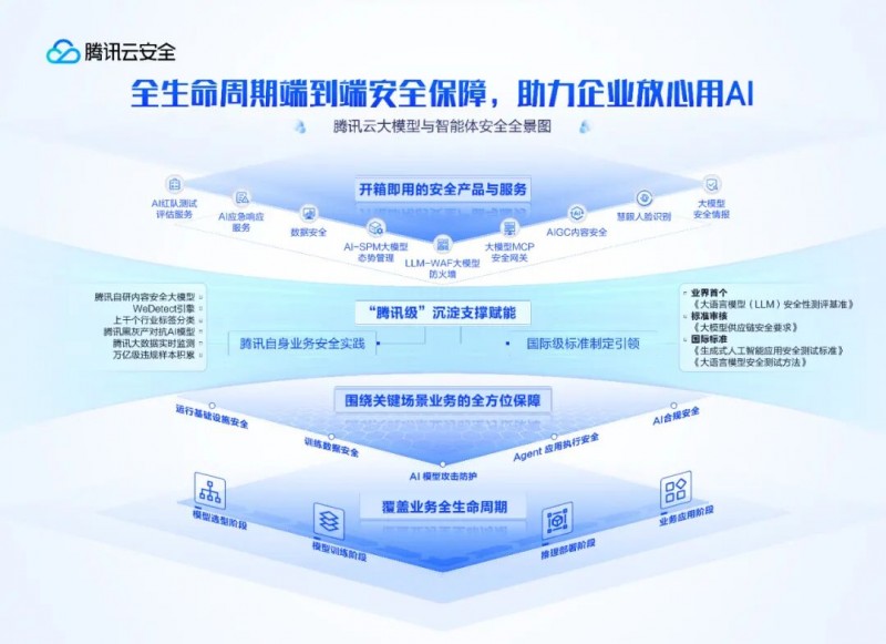 我们已然迈入以大模型为核心驱动力的AI时代,当下,AI不仅超越图灵测试,实现类人化交互,成为下一轮经济增长的关键引擎,为解决产业痛点提供全新思路;同时,人工智能与其他创新技术一道重塑各行各业的过程中,也伴随着不断演变的网络威胁。从攻防视角来看,大模型安全风险贯穿AI技术从数据采集到最终应用的完整生命周期,其多样性与严重性早已在多个典型案例中尽显无遗。面对大模型驱动的新型攻击,传统防御体系已捉襟见肘,构建AI时代的纵深防线刻不容缓。在大模型的应用上,腾讯覆盖了从底层技术研究、企业服务到终端应用的全链路解决方案,同时也为大模型落地的全生命周期保障构建了一套端到端的产品服务体系。在本次国家网络安全宣传周网络安全博览会上,腾讯重点展示了大模型与智能体安全全景图,融合了多年“腾讯级”实战经验沉淀,形成结构化风险治理框架,既包含了开箱即用的安全产品与服务,也有围绕关键场景业务的全方位保障,助力企业放心用AI。