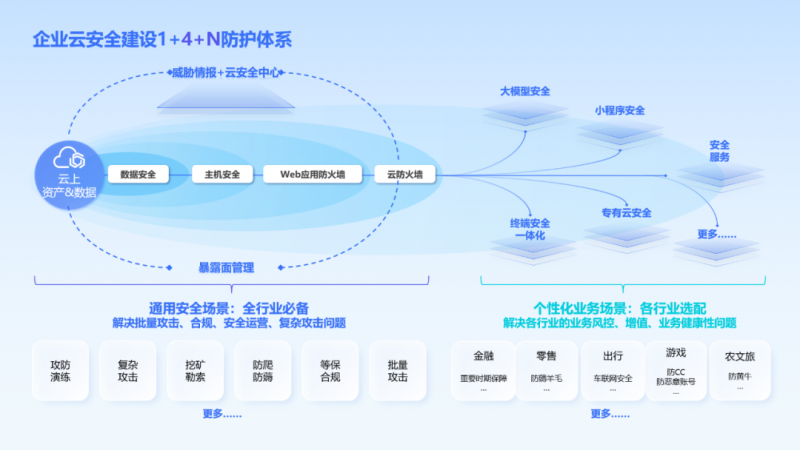 为帮助企业建立全面、高效的防护体系,应对上述共性和个性问题,腾讯安全打造云安全“1+4+N”防护体系:以暴露面管理为情报兵,梳理资产暴露面,前置风险;通过数据安全、主机安全、Web应用防火墙、云防火墙这4道防线构筑稳固的云上安全防御体系,并通过云安全中心统一管理,统一运营,解决云上安全的“基础设施建设”问题;通过游戏反外挂、营销疯狂、借贷反欺诈、文旅反黄牛等N种行业安全解决方案,帮助企业应对不同的安全需求,为业务发展增值提效。
