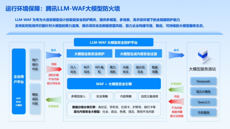 与此同时,腾讯云安全升级发布LLM-WAF大模型防火墙。作为专为大语言模型设计的智能安全防护网关,腾讯LLM-WAF安全模块提供多模型、多场景、高并发环境下的全链路防护能力,支持实时检测并拦截针对大模型的算力滥用、提示词攻击及数据泄露风险,助力企业构建可信、稳定、可持续的大模型服务生态。