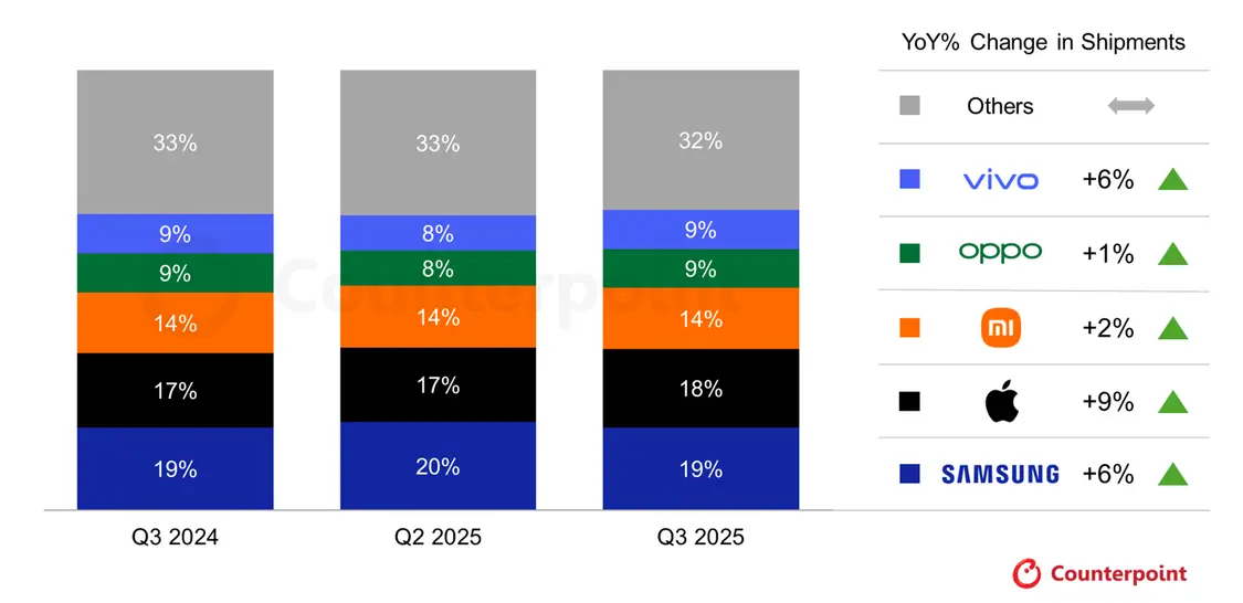 10 月 16 日消息,市场调查机构 CounterPoint Research 昨日(10 月 15 日)发布博文,报道称得益于亚太地区(APAC)和中东及非洲(MEA)地区的强劲表现,2025 年第 3 季度全球智能手机市场出货量同比增长 4%。