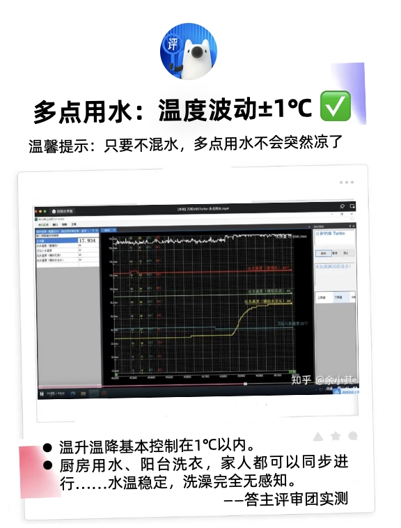 在多点用水测试中,评审团答主@王昊诚在家中进行了多水路并发测试,模拟了厨房和浴室同时用水的场景。结果显示,万和安睡洗V9S TURBO能够确保在多个用水点同时开启的状态下,出水温度浮动范围始终控制在±0.5℃以内,远优于行业普遍 3~5℃ 的波动表现。这意味着,即便有人在浴室洗澡,也可以正常在厨房用热水洗碗,同时在阳台开水洗衣服,一家人可同时安心用水。